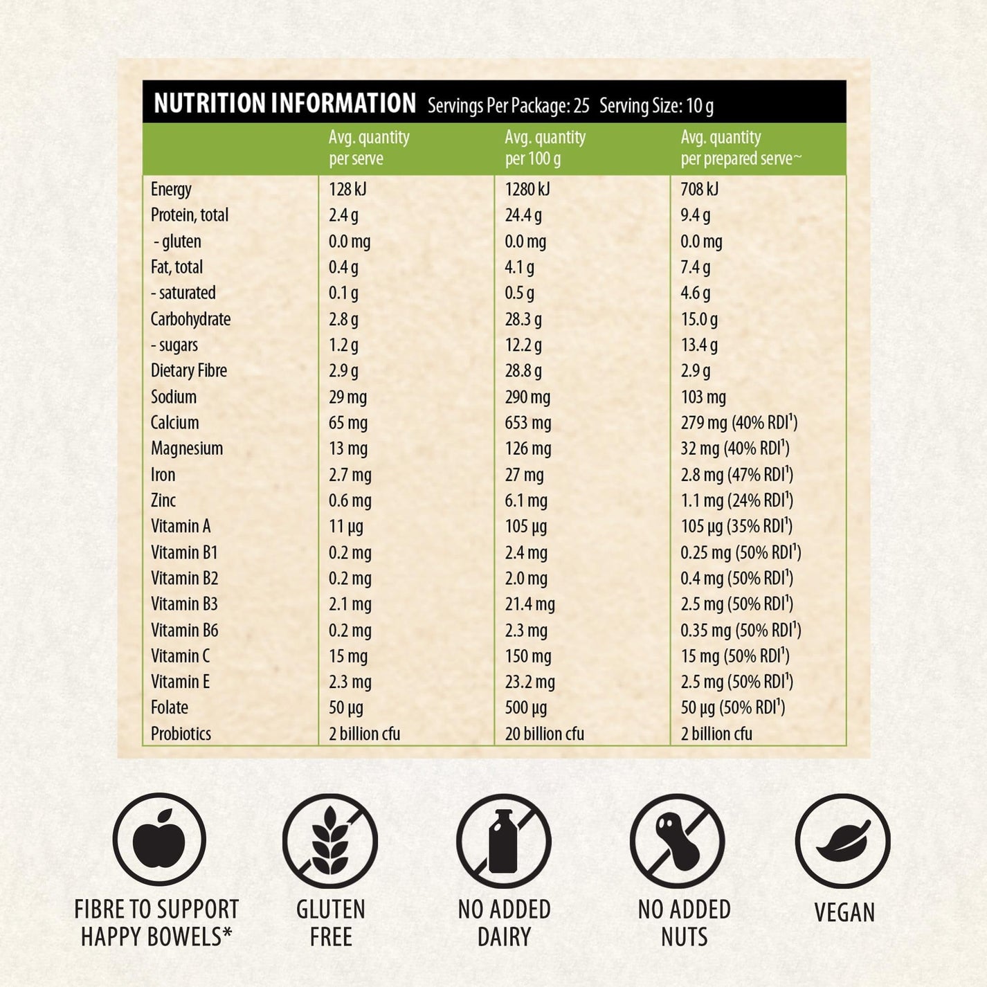 Hỗn hợp Chất xơ (36%) (Fructooligosaccharide hữu cơ, Inulin hữu cơ, Hạt chia, Hạt lanh, Tinh bột kháng chuối xanh, Pectin táo, Gôm Arabic, Vỏ hạt mã đề),Đạm đậu Hà Lan hữu cơ (12%), Đạm gạo lứt hữu cơ (12%),Hương vani tự nhiên, Lucuma hữu cơ, Chuối, Lê (4%),Khoáng chất (Canxi, Magie, Sắt, Kẽm),Táo (3%),Đậu vani, Hỗn hợp Probiotic (L. acidophilus, B. bifidum, B. lactus, B. longum),Chất làm ngọt (Chiết xuất quả la hán),Nấm (1%),Súp lơ (1%),Bông cải xanh (1%),Cải xoăn (1%*),Vitamin (C, E, B3, A, B1, B6, B2, Axit Folic),Chiết xuất Lô hội.